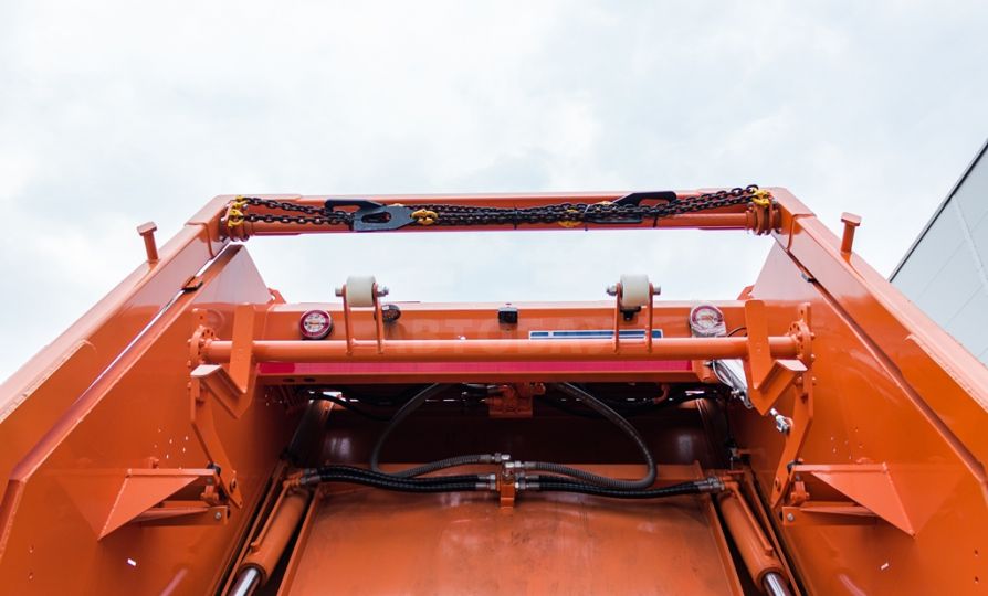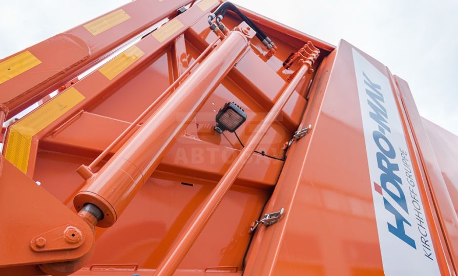 Мусоровоз имеет прессующую плиту, изготовленную из высокопрочной стали, выполняющую функцию забора и прессования отходов из загрузочного бункера в основной (приводится в действие четырьмя гидроцилиндрами), и выталкивающую плиту, которая выполняет функцию обратной нажимной пластины и позволяет производить процесс подпрессовки. В зависимости от плотности отходов, коэффициент уплотнения может увеличиваться до 1:6.