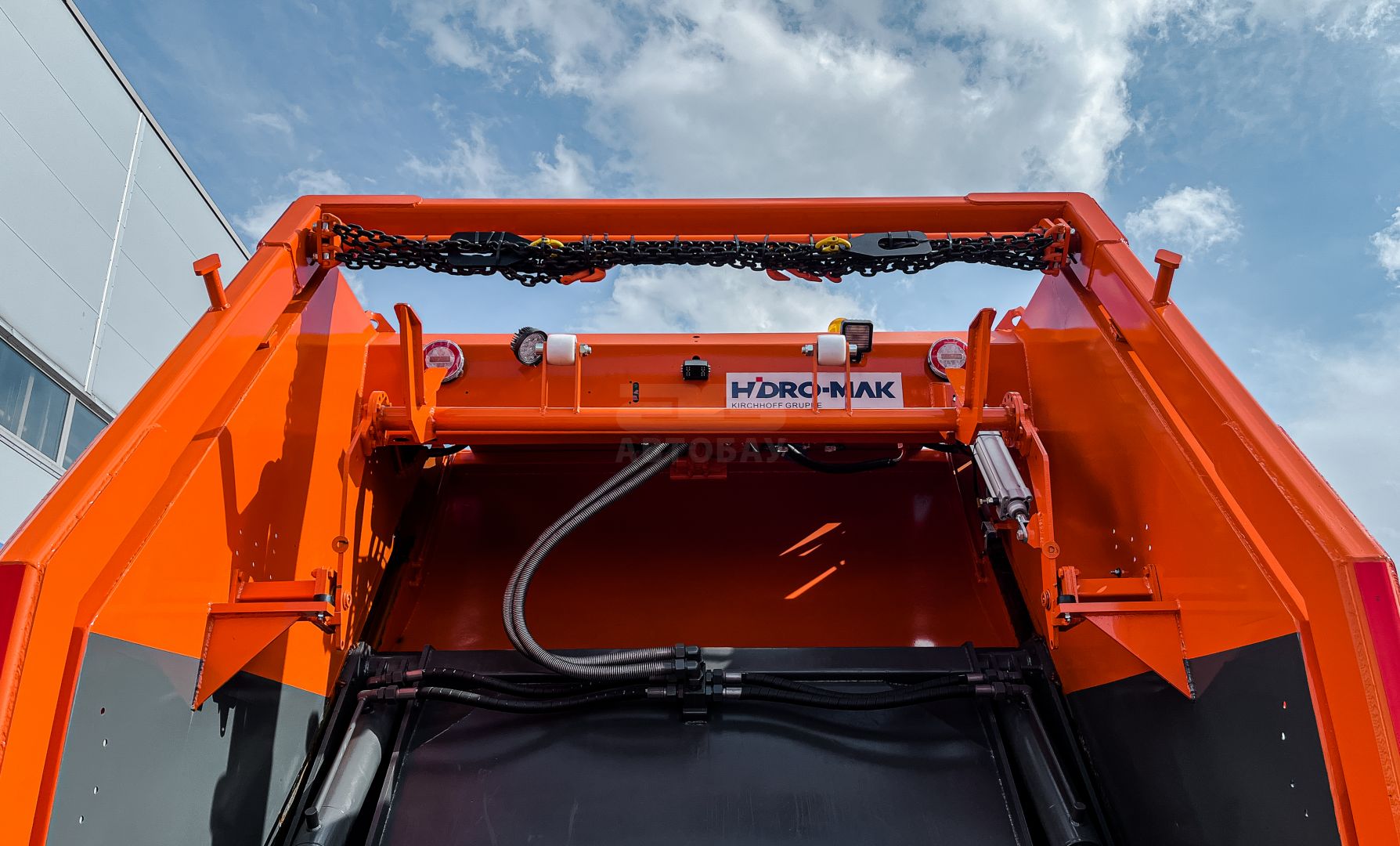 - Выталкивающая плита – специальной геометрической формы с уплотнителем, позволяет увеличить полезный объём кузова и обеспечивает более равномерные нагрузки на оборудование при прессовании и выгрузке мусора (совместная разработка HIDRO-MAK и FAUN KIRCHHOFF Gruppe)