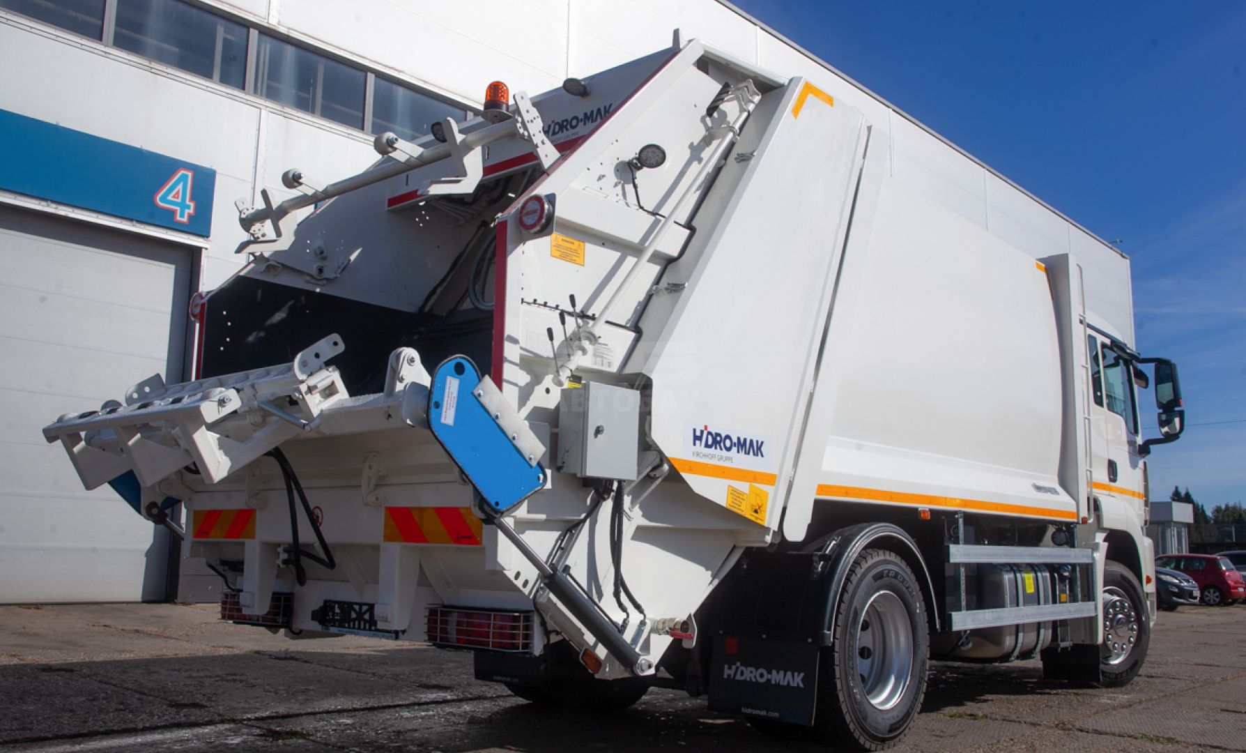 Мусоровоз имеет прессующую плиту, изготовленную из высокопрочной стали, выполняющую функцию забора и прессования отходов из загрузочного бункера в основной (приводится в действие четырьмя гидроцилиндрами), и выталкивающую плиту, которая выполняет функцию обратной нажимной пластины и позволяет производить процесс подпрессовки. В зависимости от плотности отходов, коэффициент уплотнения может увеличиваться до 1:6.