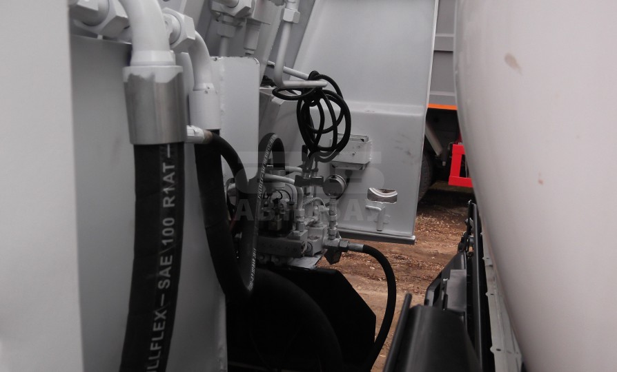 После заполнения бункера мусоровоз в зависимости от маршрутного задания может разгрузиться либо на площадке для сортировки мусора, либо непосредственно в большой мусоровоз с задней загрузкой. Для этого мусоровоз с собранными отходами подъезжает вплотную к заднему борту приемного мусоровоза и откидывает разгрузочный борт, ложащийся на задний борт приемного мусоровоза. Мусор выгружается из бункера выталкивающей плитой, приводимой в действие гидроцилиндром по направляющим профилям, расположенным на правом и левом борту накопителя. В приемном мусоровозе запускается процесс загрузки мусора из заднего борта в автоматическом или полуавтоматическом режиме в бункер. Оператор мусоровоза визуально контролирует количество поступающего мусора во избежание просыпания мусора на землю замедляя или ускоряя движение выталкивающей плиты. Выталкивающий щит по направляющим профилям перемещается до заднего края бункера, полностью освобождая от мусора внутреннее пространство. После завершения процесса выгрузки, задний борт фиксируется в закрытом положении, выталкивающий щит перемещается максимально вперед, лопата опускается в нижнее положение. Мусоровоз готов к дальнейшей работе.